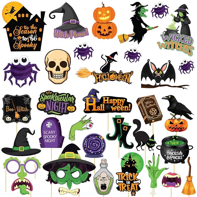 34 cardstock cutouts featuring witches, ghosts, pumpkins, bats & skulls