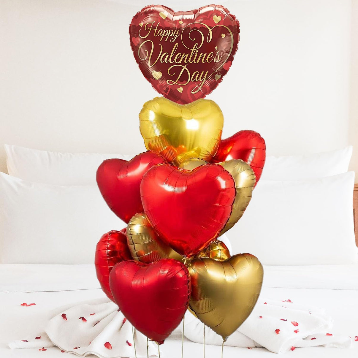 Introducing our captivating love balloon set, featuring 1 "I Love You" printed heart foil balloon, 5 golden heart foil balloons, and 5 red heart foil balloons.